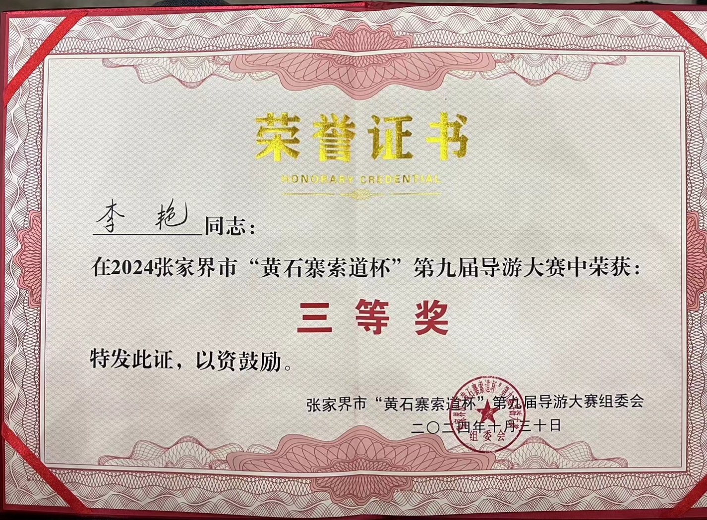 我們很高興地宣布,張家界康輝旅行社在近期舉行的黃石寨導(dǎo)游大賽中取得了優(yōu)異成績,榮獲二等獎(jiǎng)和三等獎(jiǎng)。