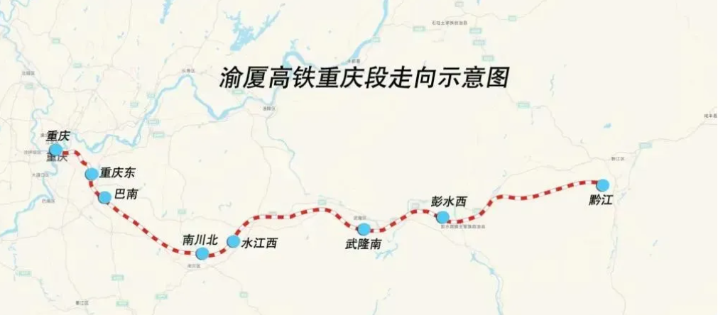 線路介紹渝廈高鐵重慶段從重慶中心城區(qū)到黔江區(qū),全長(zhǎng)269.5公里,是國(guó)家中長(zhǎng)期鐵路網(wǎng)規(guī)劃的“八縱八橫”高鐵網(wǎng)中渝廈通道的重要組成部分。